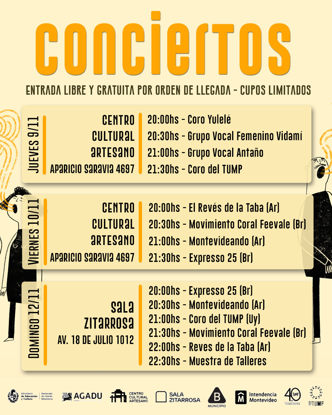 Durante los cuatro días en los que se desarrollará evento, los participantes tendrán la oportunidad de disfrutar de conciertos y presentaciones de cuatro coros de Uruguay (Coro Yulelé, Grupo Vocal Antaño, Grupo Vocal Femenino Vidamí y el Coro del Tump) y cuatro coros extranjeros (Expresso 25, Movimiento coral Feevale de Brasil, Montevideando y Revés de la Taba de Argentina). Además, se ofrecerán talleres impartidos por los directores de los colectivos corales participantes.