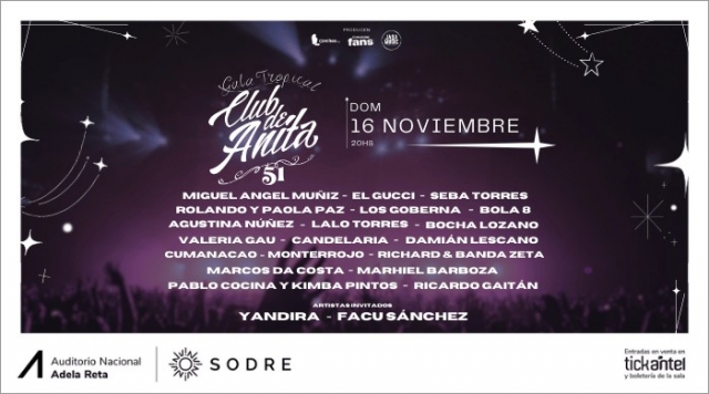 En esta nueva GALA TROPICAL presentamos la Fiesta de “El Club de Anita”, en la celebración de sus primeros 51 años y celebrando con un gran espectáculo reuniendo a los mejores exponentes de la movida tropical de nuestro país. Contaremos con la presentación de Marhiel Barboza, Miguel Ángel Muñiz, El Fata Delgado, Bola 8, Monterrojo, La Decana, Rolando Paz, Candelaria, El Guchi, Seba Torres, Cumanacao, Paola Paz, Richard y Banda Zeta, Valeria Gau, Marcos Da Costa, Lalo Torres, Agustina Núñez, Bocha Lozano, y muchos más.