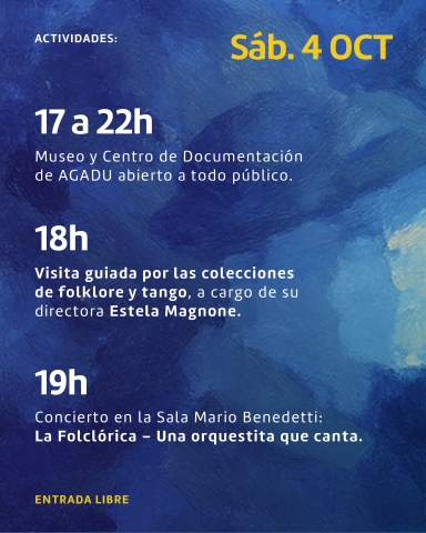 El sábado 4 de octubre, entre las 17 y las 22 horas, el Museo y Centro de Documentación de AGADU abrirá sus puertas al público. A las 18 horas se realizará una visita guiada a cargo de su directora, Estela Magnone, con foco en las colecciones de folklore y tango.