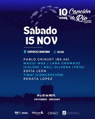 Festival Canción de río Paysandú 2025. Un río que suena hace diez años. En su recorrido, Canción de Río ha recibido más de cincuenta propuestas artísticas, desde proyectos emergentes hasta figuras consagradas, consolidándose como un faro cultural en la región.