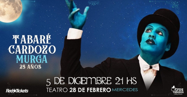 Tabaré Cardozo celebra sus 25 años de trayectoria presentando su nuevo vinilo "MURGA" con las canciones clásicas murgueras de todo su repertorio. Tabaré Cardozo junto a su banda en el Teatro 28 de Febrero de Mercedes.