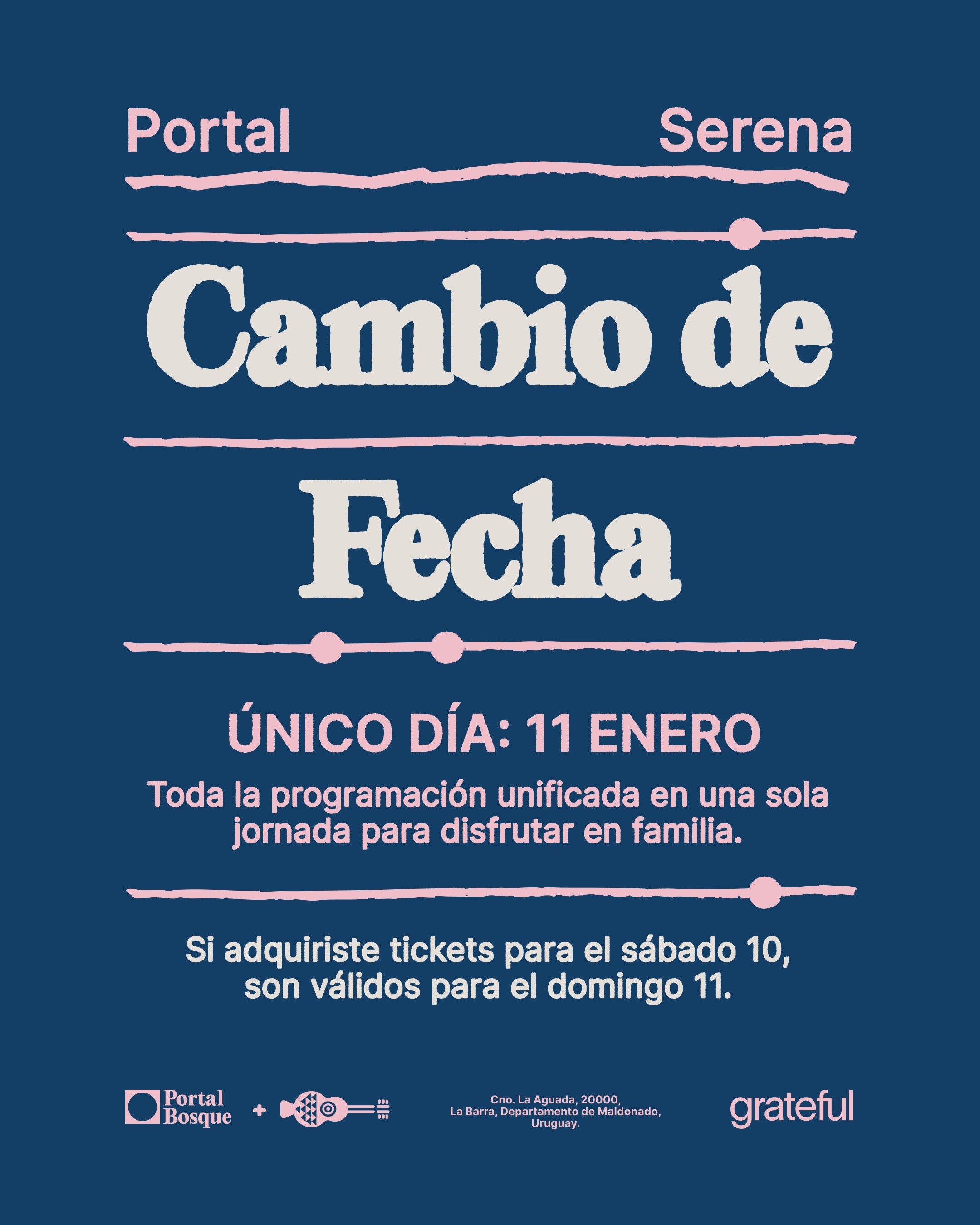 Debido al pronóstico climático adverso, con fuertes tormentas previstas para el sábado 10 de enero, y priorizando la seguridad de artistas, público y equipo de trabajo, hemos decidido reprogramar la primera jornada del festival.
