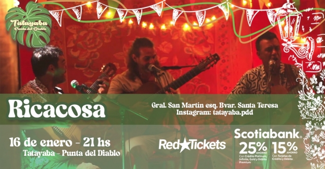 Prepárense para un espectáculo de tango, milonga, folklore y candombe inolvidable. Martín Tehera, Sebastián Rey y Matías Romero, prometen dar un espectáculo acorde a su trayectoria, nada más y nada menos que frente a la Playa de la Viuda, en el escenario de Tatayaba, en donde podrás disfrutar de buena música en un ambiente inmejorable mientras saboreas las delicias de la carta, sus tragos, y deliciosas cervezas artesanales. No vas a encontrar mejores pizzas ni postres tan deliciosos como los de este lugar!