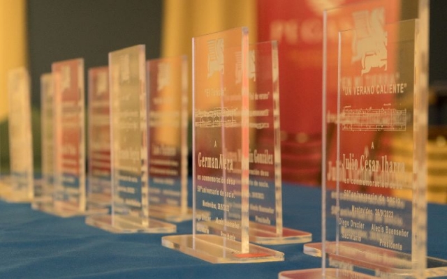 Luego de agradecer a los asistentes y a los funcionarios de la institución que han pasado por la institución a lo largo de estos cincuenta años vuelve a tomar la palabra Suárez para comenzar a otorgar las placas de reconocimiento a socios y socias de manos del presidente, del secretario general y de los consejeros Osmar Miranda y Alejandro Jasa.
