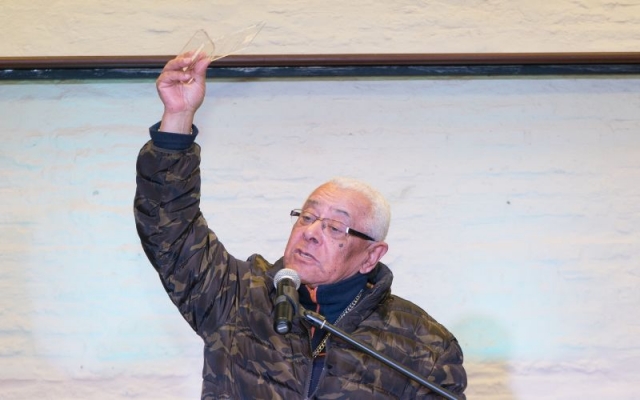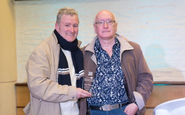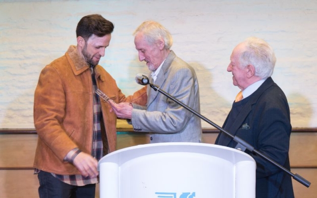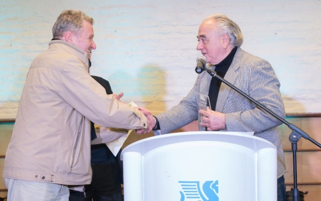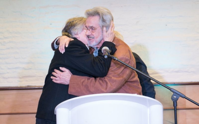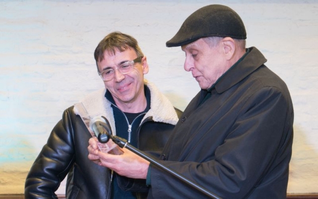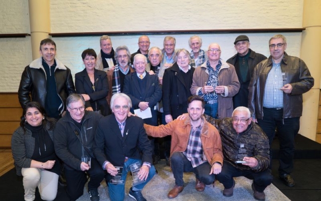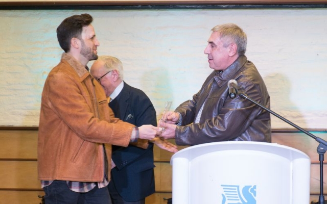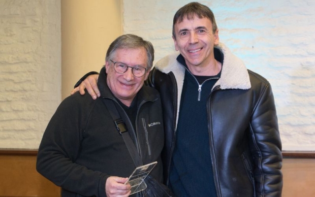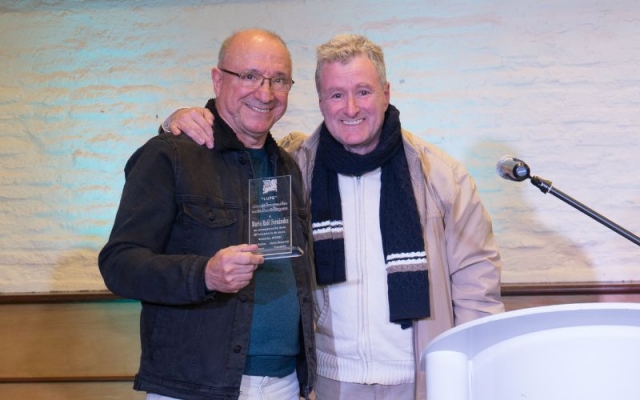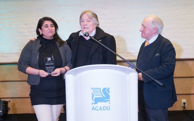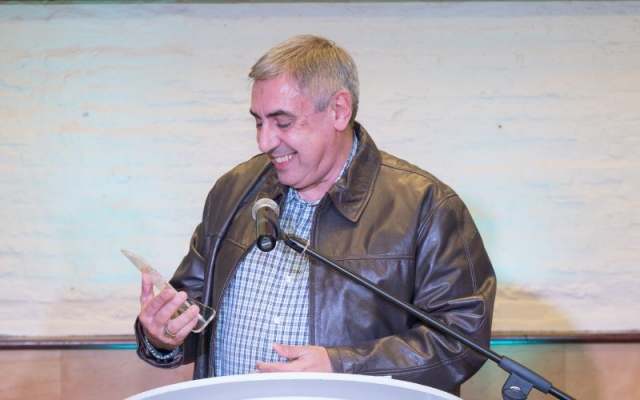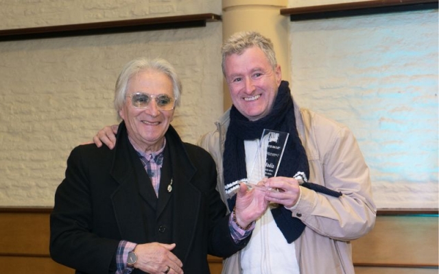 Johnny Da Luz dió las gracias por la plaqueta otorgada por AGADU, la alza al cielo en recuerdo de todos los que no están en este plano pero seguramente acompañaran desde otro.