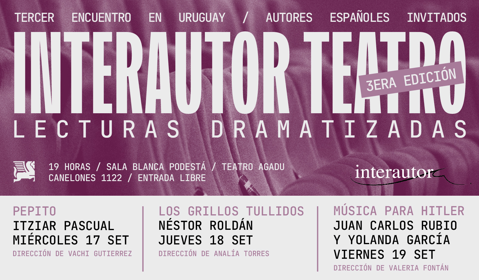 Del 17 al 19 de septiembre, la Sala Blanca Podestá - Teatro AGADU se convertirá en el epicentro del teatro contemporáneo con la 3era. Edición de Interautor Teatro 2025, un programa de intercambio organizado por AGADU y la Fundación SGAE.