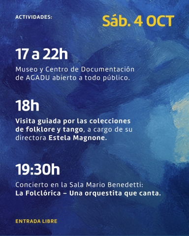 El sábado 4 de octubre, entre las 17 y las 22 horas, el Museo y Centro de Documentación de AGADU abrirá sus puertas al público. A las 18 horas se realizará una visita guiada a cargo de su directora, Estela Magnone, con foco en las colecciones de folklore y tango.