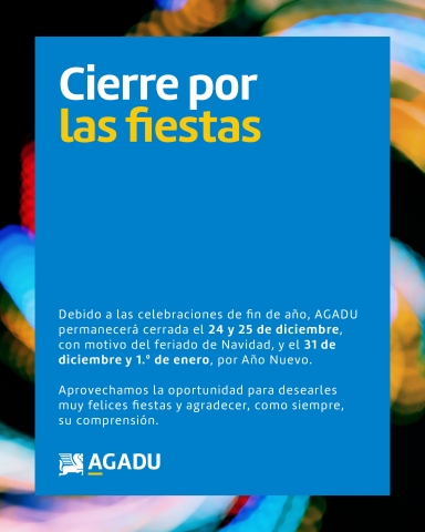 Debido a las celebraciones de fin de año, AGADU permanecerá cerrada el 24 y 25 de diciembre, con motivo del feriado de Navidad, y el 31 de diciembre y 1.º de enero, por Año Nuevo.