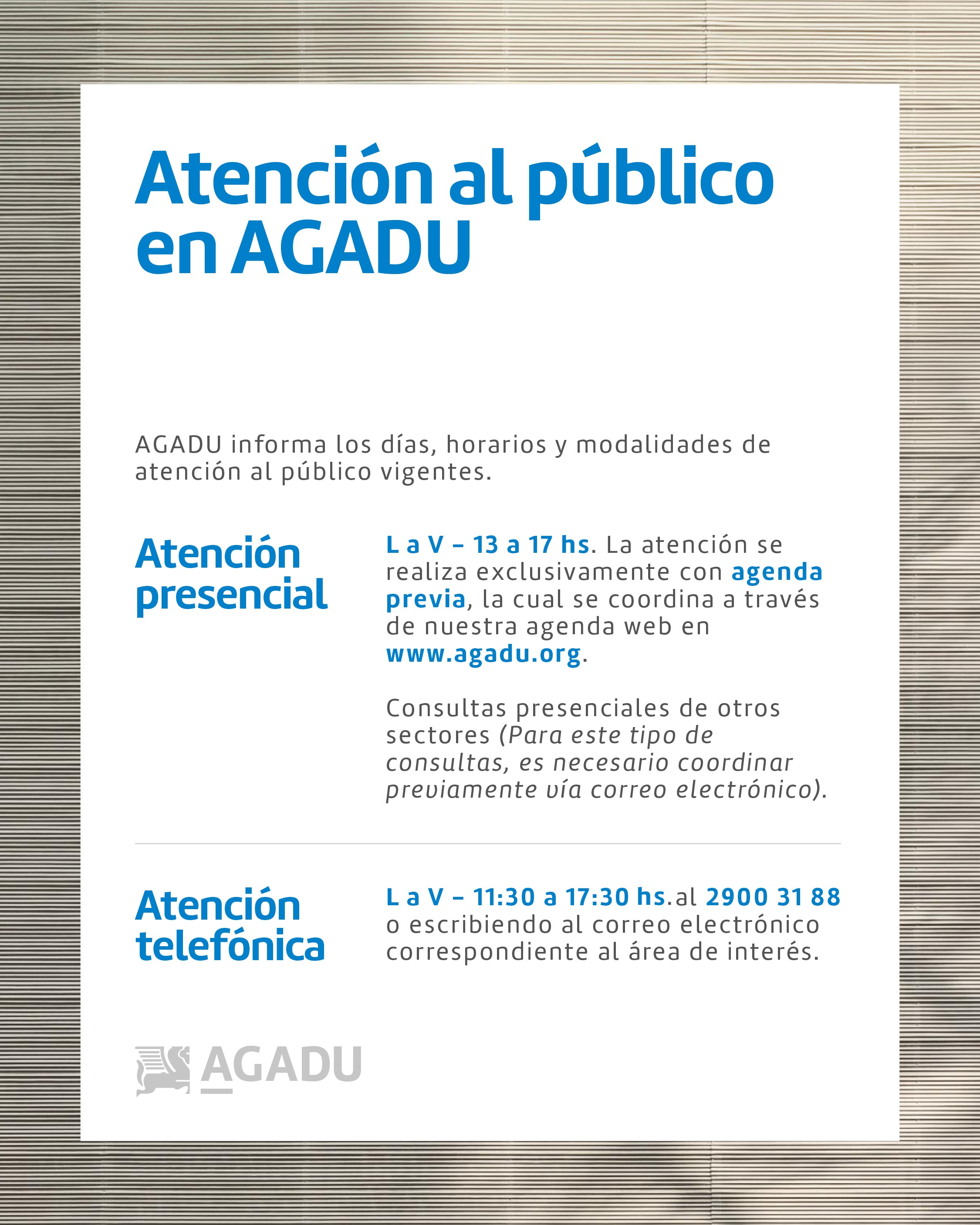 Desde AGADU informamos que retomamos nuestras actividades con normalidad y compartimos a continuación los días, horarios y modalidades de atención al público vigentes: