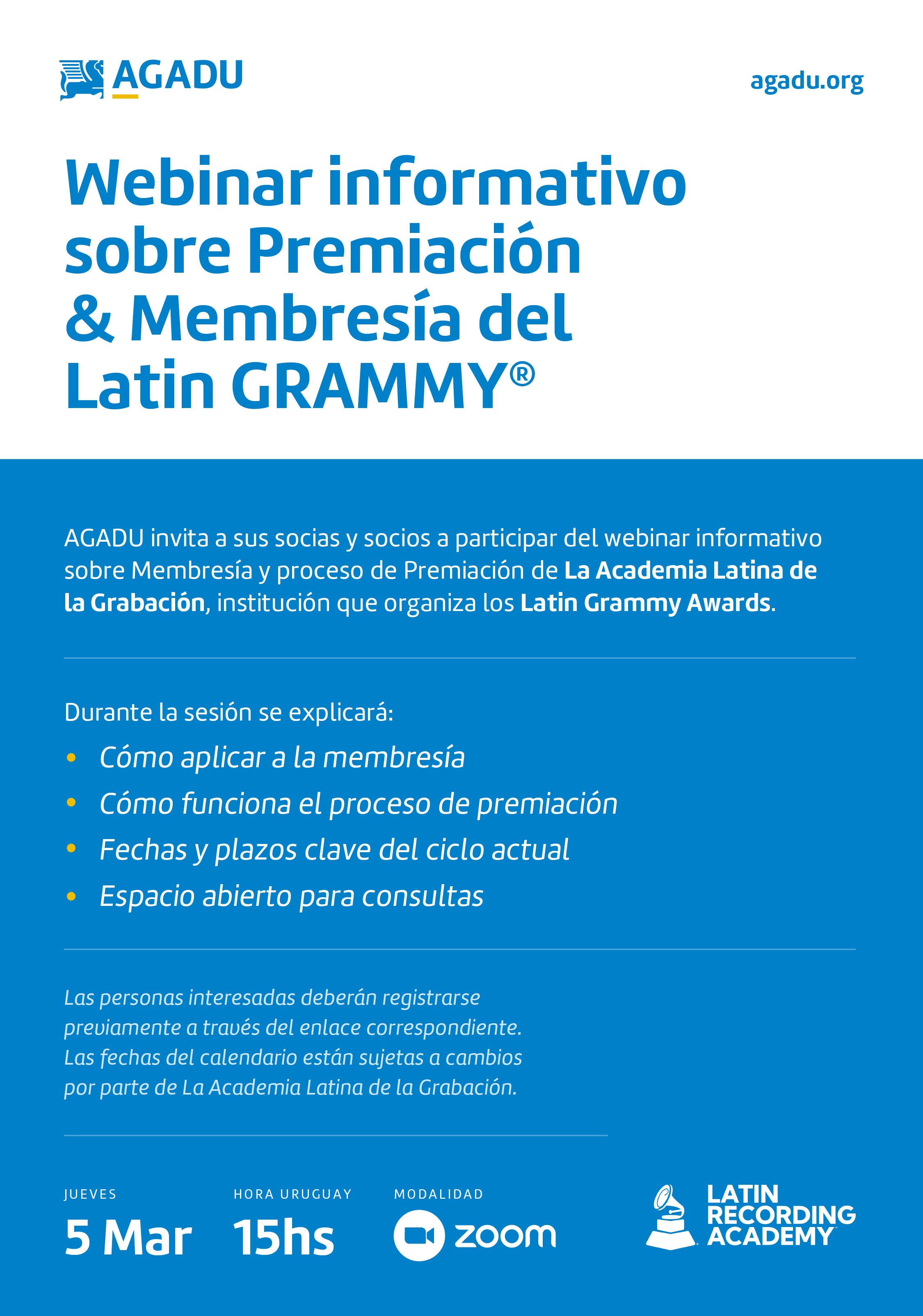 2 de Marzo de 2026AGADU invita a sus socias y socios a participar del webinar informativo sobre Membresía y proceso de Premiación de La Academia Latina de la Grabación, institución que organiza los Latin Grammy Awards.