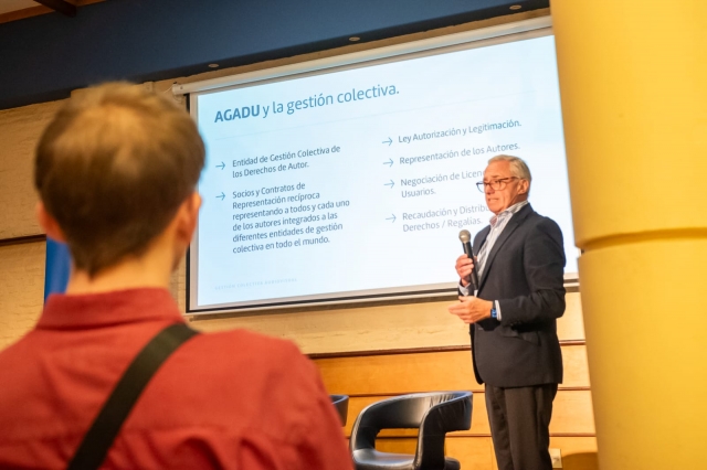 Durante la instancia se presentó el funcionamiento de AGADU como entidad de gestión colectiva, detallando sus principales procesos: registro de obras, identificación de titulares, fijación y homologación de tarifas, negociación de licencias con usuarios, y recaudación y distribución de derechos.